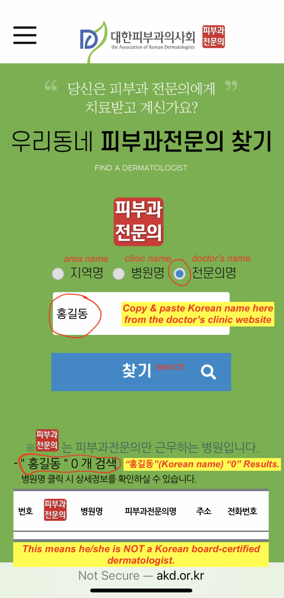 Example of search result (Korean board-certified dermatologist)